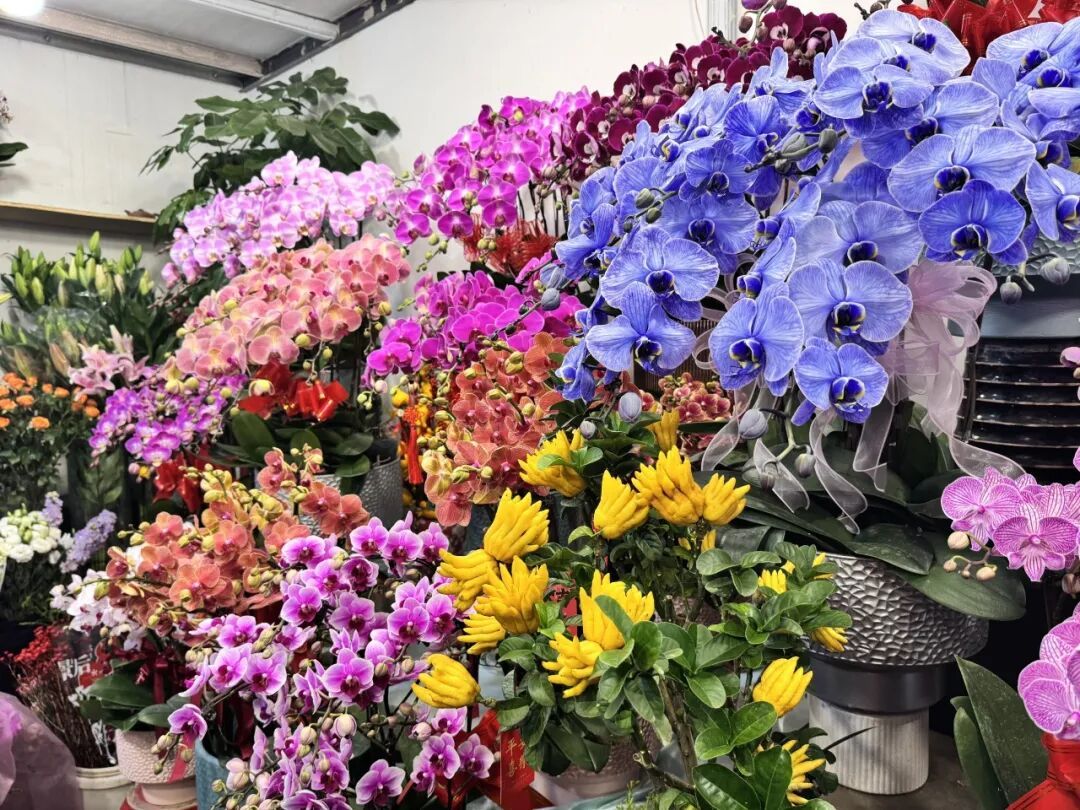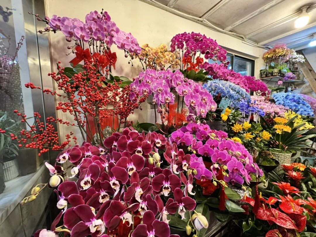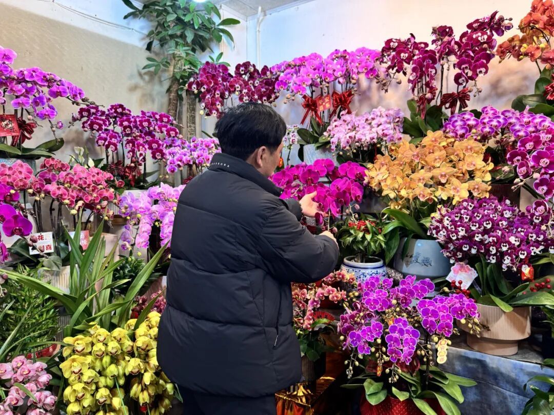 老魏笑着告诉记者:“老伴特意嘱咐要选一盆有‘年味’的蝴蝶兰,可我看着都漂亮,挑花了眼。”最终,他在侯师傅推荐下选中了一盆花型饱满、带有七支花箭的紫红色蝴蝶兰,盆上还缀有中国结与金色饰物。“侯师傅说这叫‘鸿运当头’,名字喜庆,造型也富贵。”