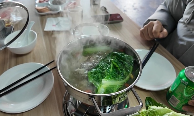 位于采摘区不远处的均瀛宴餐厅内,定制小火锅里沸腾着特制的“霸王别姬”汤底——甲鱼与土鸡慢炖的奶白高汤,香气扑鼻。亲子家庭将自己采摘的蔬菜等食材放入锅中,空气中弥漫着蔬菜的清甜与火锅的醇香。“我们刚采的菜,现在就吃上了,非常的新鲜。”游客们纷纷说。
