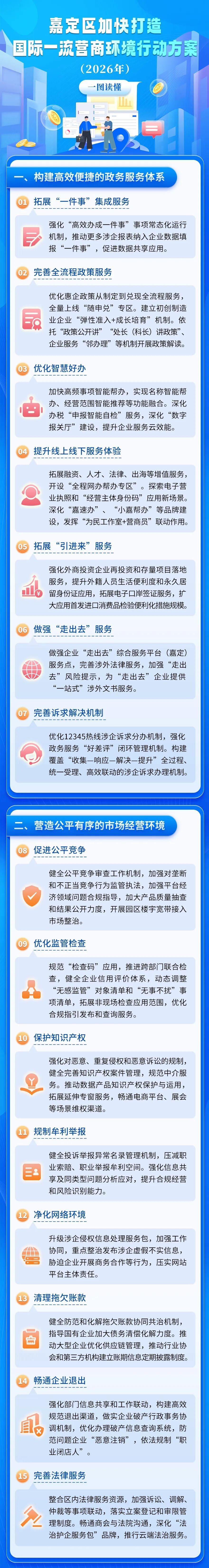2026年是实施"十五五"规划的开局之年,嘉定区坚持以企业感受为标尺、以市场评价为导向,发布9.0营商行动方案,围绕政务服务、市场环境、产业生态、社会氛围等方面提出30项133条重点举措,旨在持续提升企业感受,激发经营主体活力。