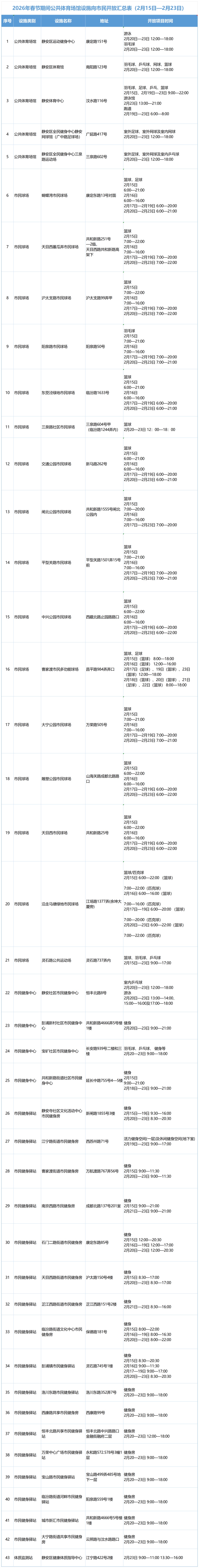 春节假期有什么健身计划?为更好地满足广大市民健身需求,春节假期中,静安区43处公共体育场馆向市民开放,开放项目包括足球、篮球、网球、乒乓球、羽毛球、游泳、健身等,更有体质监测可精准分析体质健康水平。