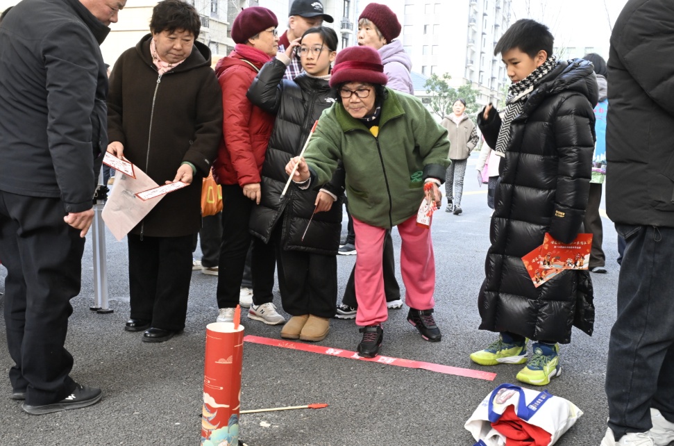 室外活动区同样是居民重温邻里情、喜迎幸福年的欢乐阵地。“步步高升”投壶游戏、“年年有余”套圈、“团圆拼图”挑战,还有手艺人现场制作“福”“春”“马”主题剪纸、DIY拓印“家”……大家在开怀欢笑中感受家园的崭新变化。