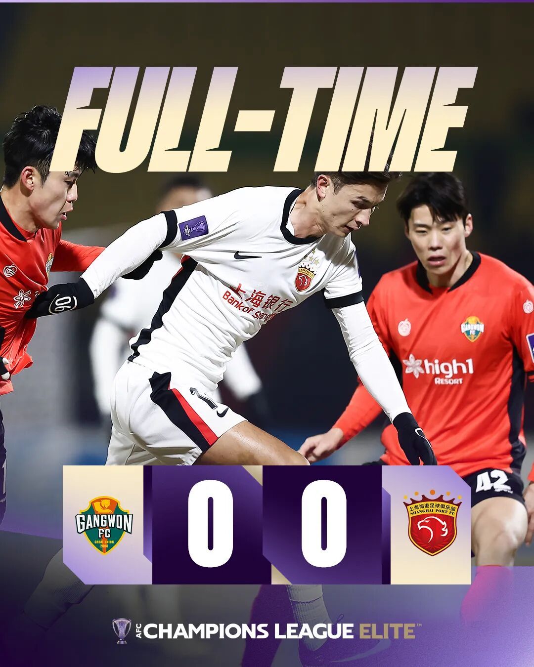 亚冠精英联赛东亚区第7轮,上海海港在春川松岩体育城客战江原FC。上半场冯劲低射击中边网,两队合计0射正,半场0比0战平。下半场两队也都无力改写比分,江原FC有两次射正,海港2次射门0射正,最终两队0比0战平。