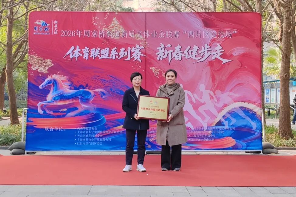 仪式上,长宁区体育局为周家桥街道颁发“全国群众体育先进单位”铜牌。现场宣布2026年周家桥街道西片区联盟成员名单,并公布上半年西片区联盟体育赛事菜单。
