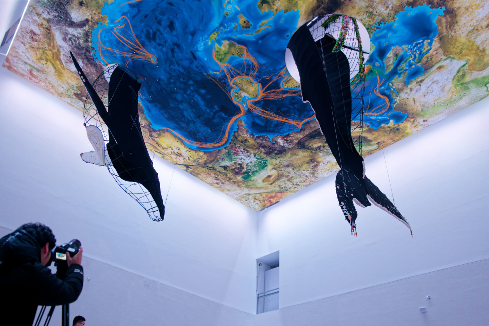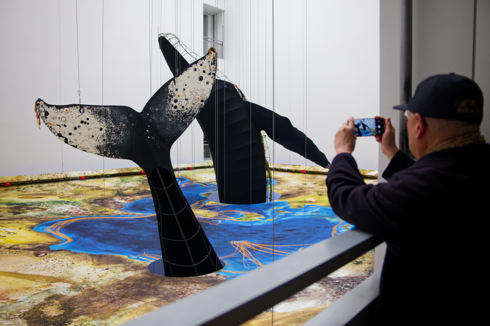 作为一头鲸鱼探出头、一头鲸鱼露出尾巴的“海平面”,卡罗莱娜·凯塞多以一块巨型织物为材料,构建了一幅以世界海洋而非陆地为中心的地图,颠覆了大众惯常的地理认知,并引领观众穿梭于“海平面”上下,以不同维度视角与鲸鱼们不期而遇。
