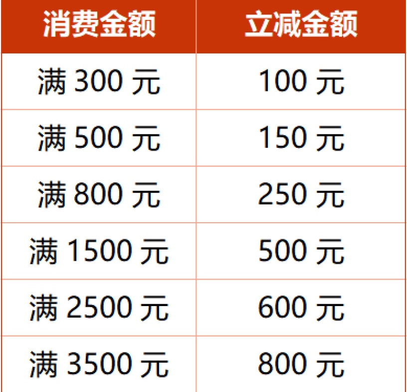 A: 共设6档满减优惠,优惠力度最高达7折: