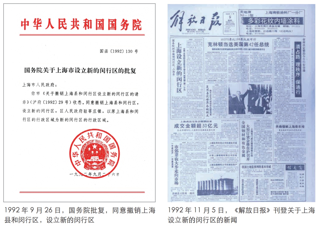 上海县和原闵行区这两个地方分分合合,终于又走到了一起。“撤二建一”后,区域面积扩大到385平方公里,常住人口达54万之众。之前是血肉相连,如今城乡一体化优势得以充分发挥,生产要素和资源配置在广阔的领域里实现最优组合。