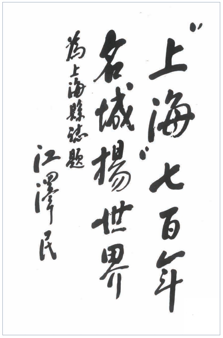 江泽民同志为《上海县志》题词:“‘上海’七百年,名城扬世界”