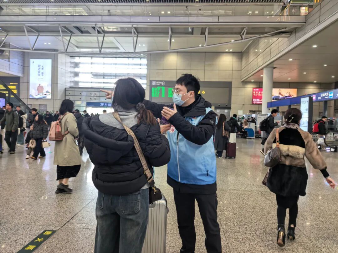 在偌大的候车大厅里,志愿者不断为旅客提供各类指引服务——从检票口到售货机、卫生间、热水间的方向,再到便利店的所在,每一个问题都得到耐心细致的解答。面对语言沟通不畅或听力不佳的旅客,志愿者们不厌其烦,配合着手势和标识指引反复说明,直到对方完全理解。