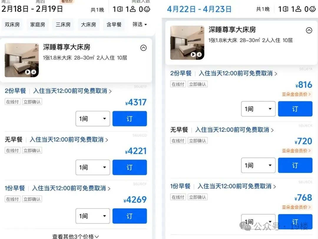 2月9日,在平台上搜索发现,以汕头万象城华山南路亚朵酒店为例,春节期间,2月18日晚(大年初二)的深睡尊享大床房已涨到4221元起,而该房型非假日价格则稳定在720元左右,涨幅近5倍。