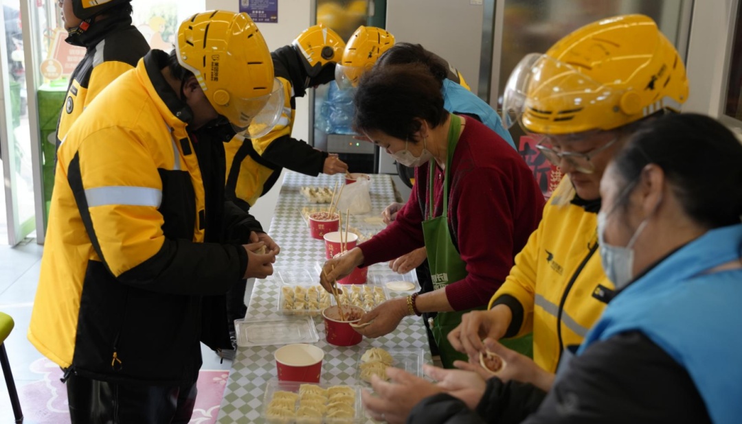 在一片欢声笑语中,来自东北的骑手刘金英成了临时老师。只见她十指翻飞,捏出的月牙饺褶子细密匀称如波浪。在志愿者的指导下,她还特意学包了几个鼓囊囊的麦穗饺,笑着解释:“寓意‘五谷丰登’,希望大家伙来年单子多、路路顺!”