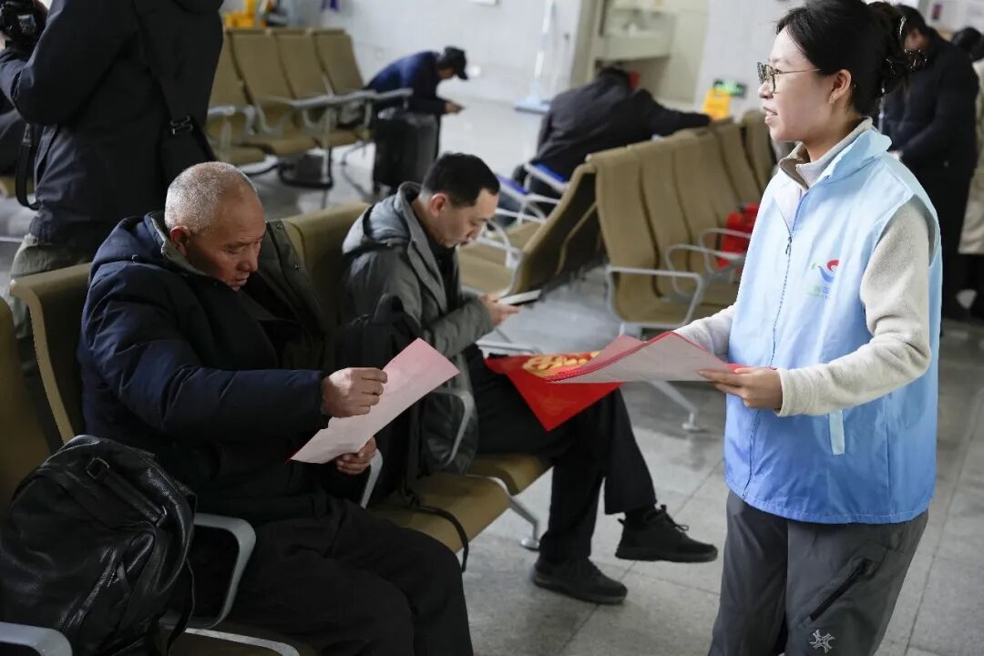 活动现场,书法志愿者挥毫泼墨,一副副春联和“福”字跃然纸上;另一侧,志愿者将写好的春联和福字分发给正在候车的旅客。
