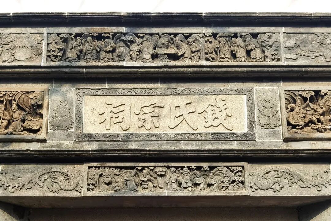 钱氏宗祠坐北朝南,总占地面积为483.61平方米。平面布置为前后二埭,两天井,东侧辅助房,四周围以青瓦白墙,第一埭东西两侧为马头墙。进门为前天井,南端山墙中间祠正门为一座砖雕门楼,正背两面各有四幅深雕图案,记载着钱氏祖上让吴越之地免于战火的“纳土归宋”等卓越功绩,正面中间石刻“钱氏宗祠”。