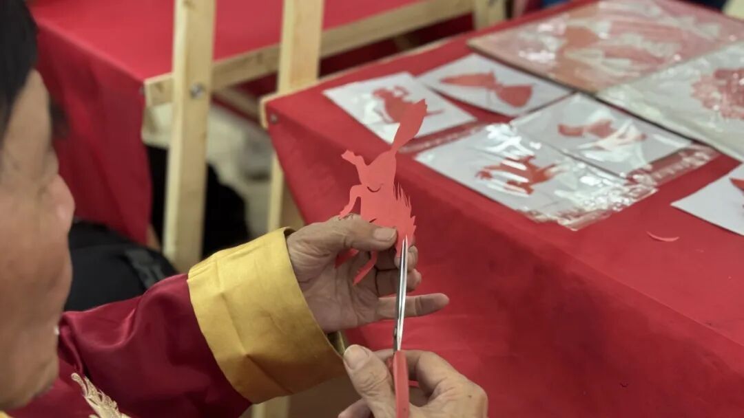 剪纸区域里,红纸翻飞,剪刀起落,艺人巧手雕琢出寓意吉祥的生肖纹样,居民们把精巧的年味与美好的新春祝愿一同带回家。面人师傅的手边更是热闹非凡,五彩面团在揉、搓、捏、粘、剪、压的连贯动作里被赋予生机,转瞬之间,憨态可掬的生肖面人便栩栩如生。吹糖人则唤醒了老辈人记忆里的经典年味。手艺人将温热的糖稀揉匀,捏成中空的糖管,居民亲手参与吹制,圆滚滚、甜蜜蜜的生肖糖人甜在嘴里,暖在心里,这份独特的滋味,牵起了几代人的童年回忆。