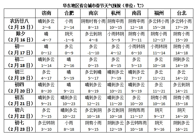 2.假期首日早晨华东中东部有雾,关注对交通出行的影响;节前、假日前期及后期华东大部有降雨天气,易造成道路湿滑,将对春运交通产生影响,建议交通等相关部门提前做好应对准备。