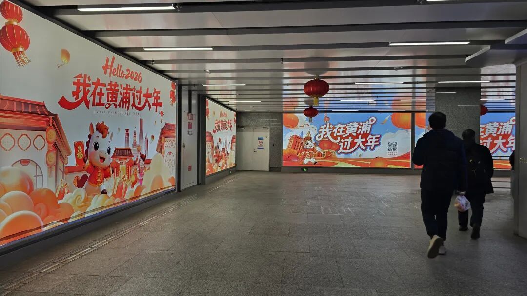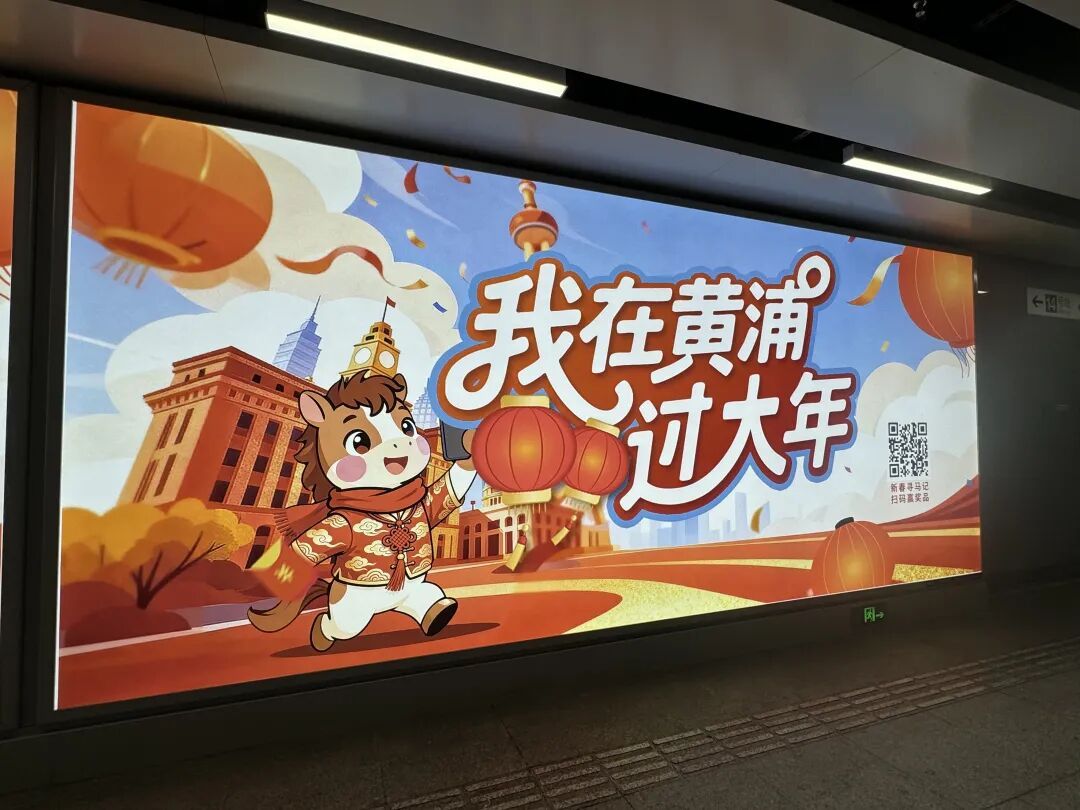 这些LED广告以喜庆的红色为主色调,搭配上灵动的骏马图案、传统的灯笼元素以及充满童趣的卡通形象,瞬间将春节的热闹氛围拉满。广告画面上,“2026上海豫园灯会”“来大豫园过上海年”等醒目文字,向市民游客发出了热情的邀请。其中,“我在黄浦过大年”的主题广告更是引人注目,可爱的马宝宝形象身着传统服饰,在东方明珠等上海地标建筑前欢快奔跑,背景中飘扬的彩带和红灯笼增添了浓浓的年味儿。