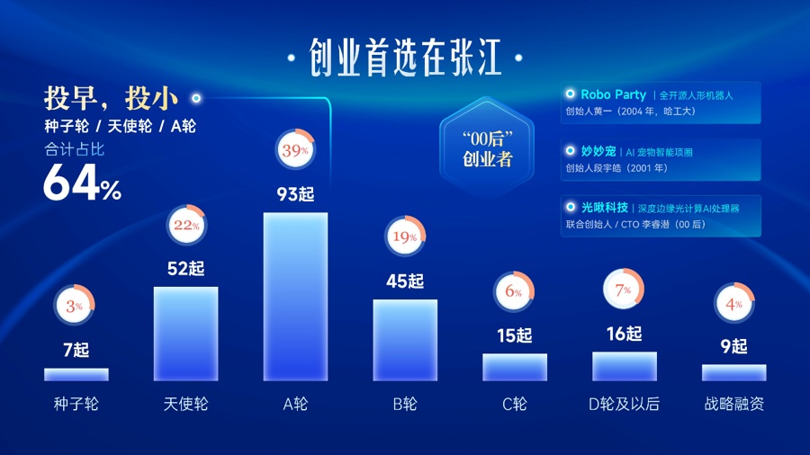 《上海市政府投资基金管理办法(试行)》明确创业投资类基金要围绕发展新质生产力,支持科技创新,重点投早、投小、投硬科技,提升自主创新能力和关键核心技术攻关能力,去年张江融资正是这一导向的写照。从融资轮次来看,237起融资中种子轮、天使轮和A轮占比64%,这不仅是资本的偏好转向,更说明很多创业者将张江作为他们创业的起点。其中,A轮融资以93起、39%的占比成为全年最活跃阶段,说明张江正在集中孕育一批具备放大潜力的成长期企业。从企业画像看新获投企业的含金量十足。210家获投企业中有75家高新技术企业、95家专精特新中小企业、27家专精特新小巨人企业和33家独角兽企业。另外,有8家企业有全球“首个”“首例”级别的突破,9家企业填补了国内技术空白,近30家在攻坚未来技术方向。如愈方生物、恩凯赛药等企业在端粒调控、能化NK细胞等技术上实现全球首创突破,开普勒机器人实现量产并斩获国际赛事冠军,奥朋医疗完成全球首例机器人辅助EVAR手术等。从融资情况可以观察到的另一个趋势是00后创业者的存在感越来越强。比如Robo派对的创始人黄一出生于2004年,在校期间就做出了全栈开源的人形机器人;“妙妙宠”是一家做AI宠物智能项圈的公司,创始人段宇皓出生于2001年,且已经是一位连续创业者。从资本参与情况看,2025年共有512家投资机构参与张江企业投融资,涵盖国有资本、产业资本及市场化创投机构等多种类型,资本结构更加多元。上海未来产业基金董事总经理李然表示,以科学家+创业者+投资人为核心的孵化新模式,正在推动颠覆式创新加速到来。