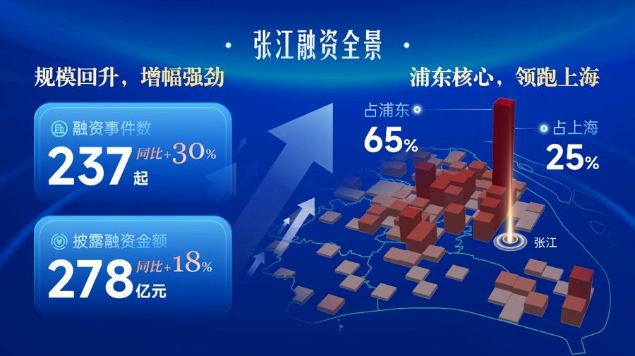 据张通社联合加冕研究院发布的《2025年张江企业融资榜单》显示,上海去年每四起科创融资,就有一起发生在张江。过去一年张江共有210家张江企业完成237起融资,披露融资金额278亿元,投融资事件数量和融资金额同比增长30%和18%。张江融资规模约占浦东65%,约占上海全市的25%。