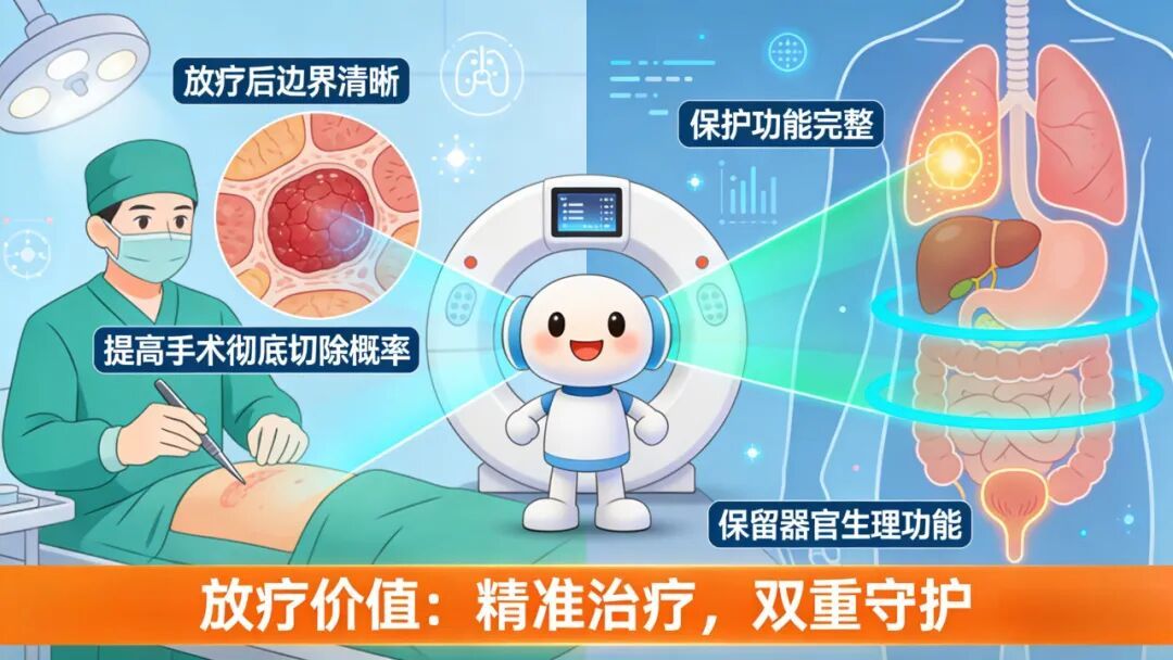 放疗的价值:提高手术彻底切除的概率。更重要的是,它能帮患者保住器官功能(比如让直肠癌患者不用挂造口袋,让乳腺癌患者保住乳房形态) 。