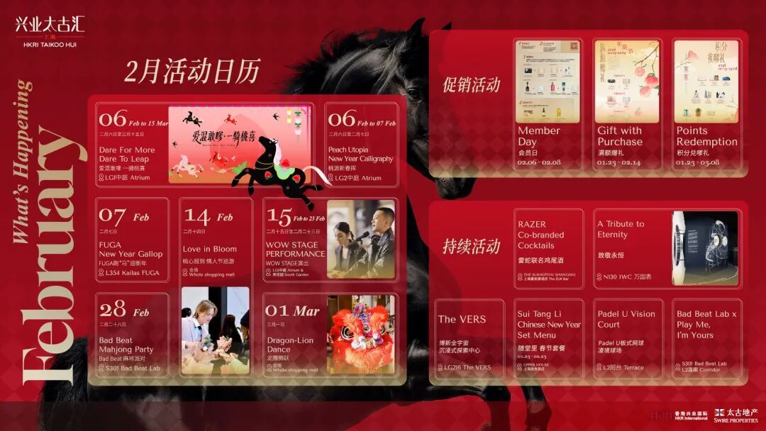 2026年2月,兴业太古汇开启“DARE FOR MORE DARE TO LEAP 爱混敢嗲 一骑桃喜”新春活动季。在这个马年新春,兴业太古汇将当代艺术、数字交互与重磅礼遇交织,把传统的“年味”酿成了一道鲜活的城市风景,邀全城共赴一场关于“腾跃”与“希望”的春日之约。