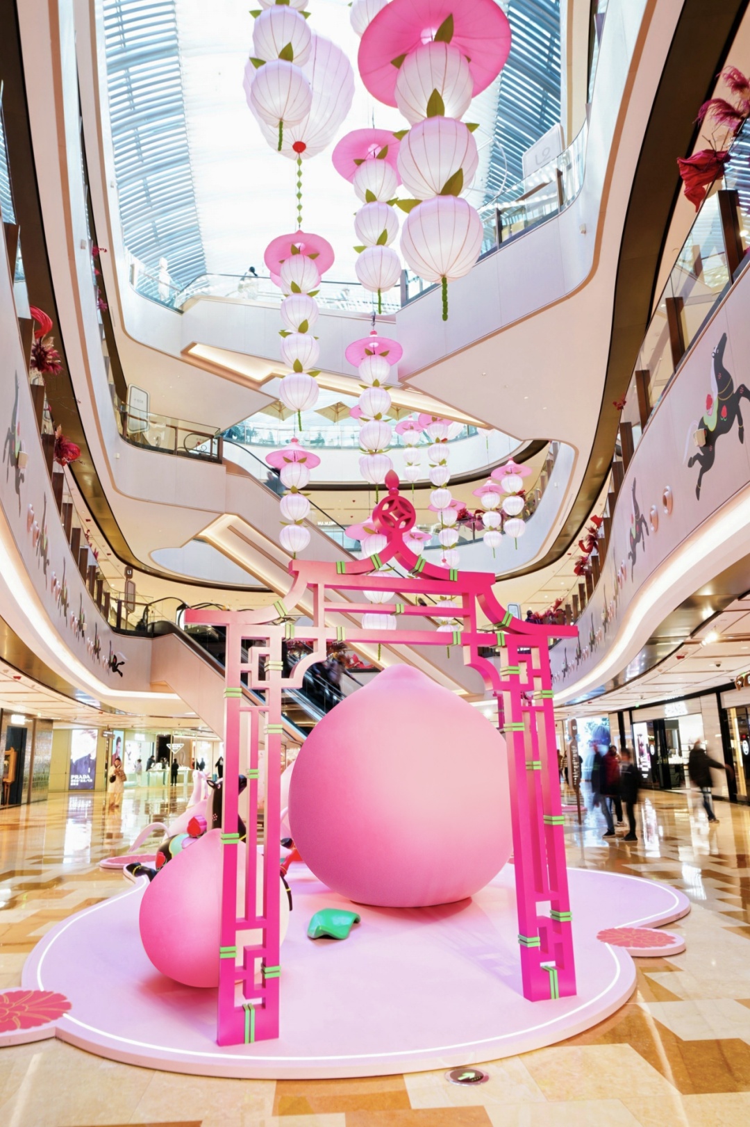 走进LG1中庭,五个巨大的桃形装置错落有致,寓意“五福临门”。不同于传统造型,这些“桃子”以极具视觉张力的现代形态呈现,象征着辞旧迎新的生命力。