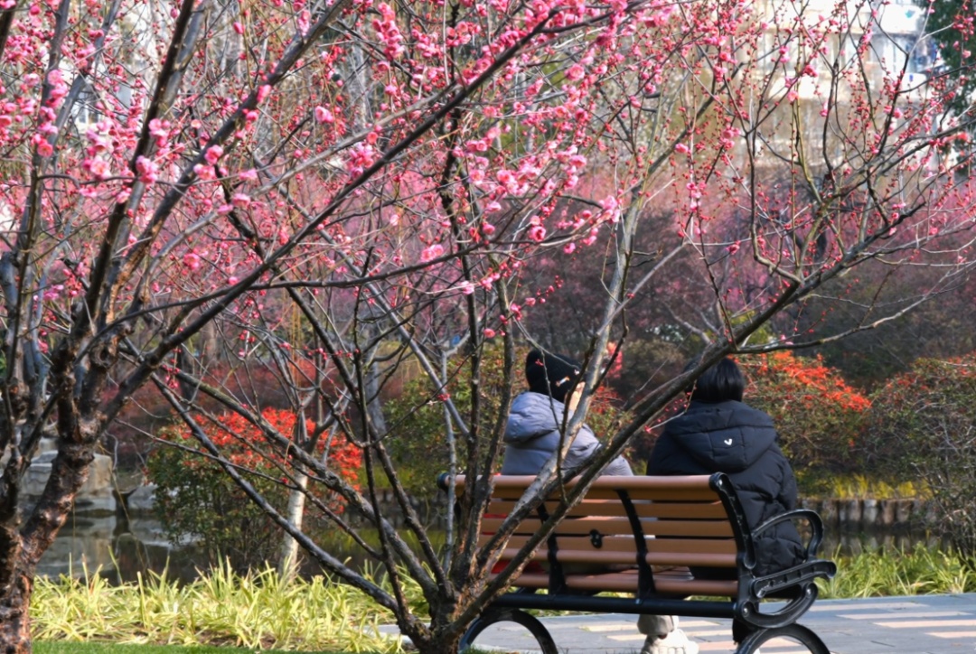 不少市民坐在梅花树下的长椅上,悠闲地享受冬日的暖阳。