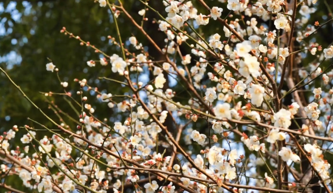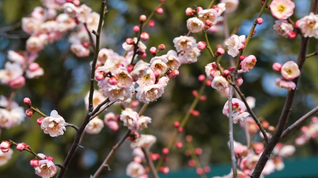 公园管理人员介绍,除了成规模的红梅,园内的白梅、玉蝶梅等品种也已盛放,形成了粉白相间、错落有致的梅花景观。