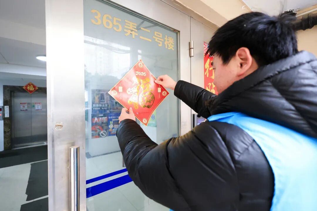 此外,年味布置也必不可少。南房集团物业公司在各小区楼栋、公共区域张贴“福”字、悬挂灯笼、布置节日灯带,璀璨的灯光点亮社区夜景,让浓浓年味萦绕在居民身边。同时,为保障居民平安过节,物业组织专业力量对辖区小区公共区域开展拉网式安全排查,重点对供排水管道、水表、消防喷淋等易受低温影响的设施进行加固、包扎、更换。在高层电梯和加装电梯内,一张张“关好电火气”的暖心提示,成为守护居民安全的小小细节。
