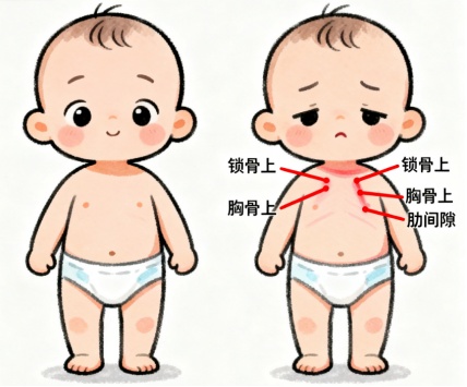 简单区分:如果孩子只是流鼻涕、轻微咳嗽,精神食欲尚可,可以先居家观察。但如果出现呼吸频率加快、喘息、或“三凹征”(吸气时锁骨上、胸骨上、肋间隙凹陷),务必立即就医!