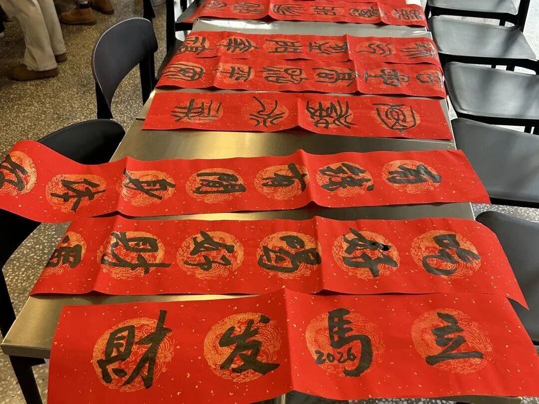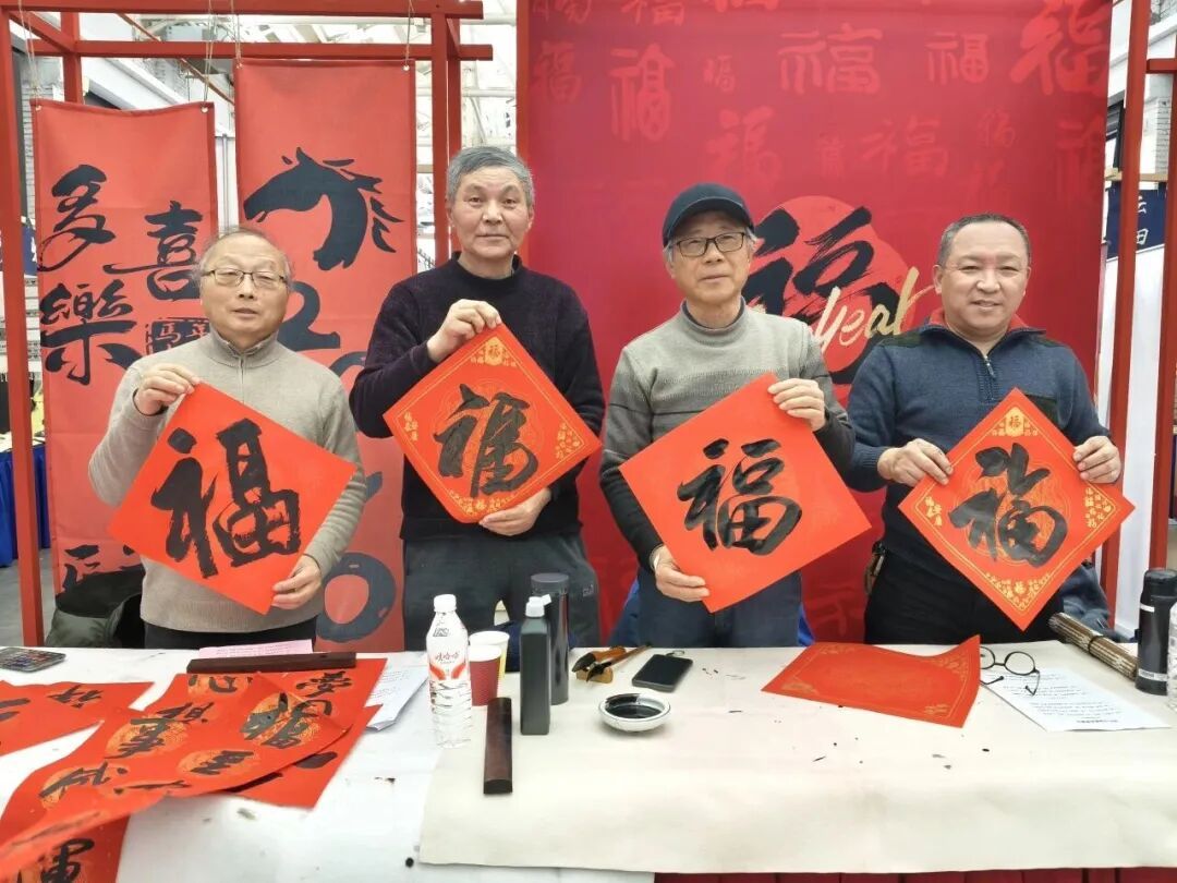 书法爱好者铺纸挥毫,一副副满载吉祥的春联和“福”字墨香流淌。