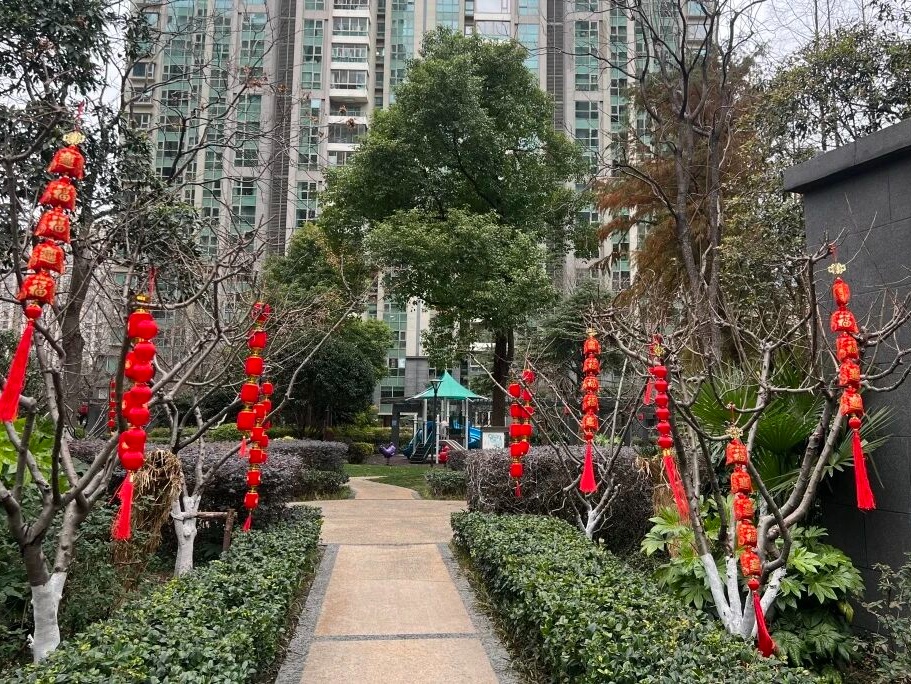 各居民区里,春联、“福”字贴满楼栋大门,志愿者们布置的灯笼串、中国结,让小区焕发新活力。