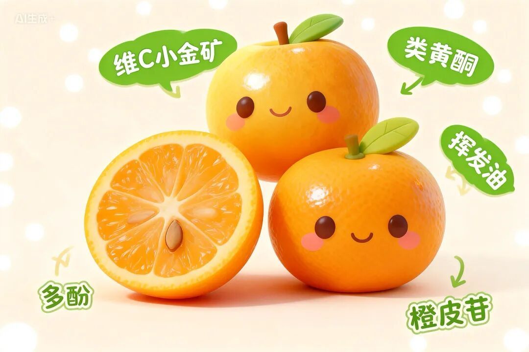 ✔果皮中含有挥发油和橙皮苷等成分,能刺激消化液分泌,促进肠胃蠕动,改善食欲不振、腹胀等不适。
