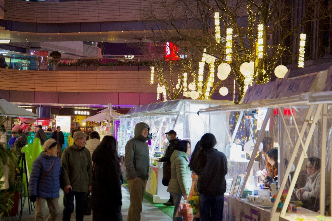 不远处的中庚漫游城,迎新市集正热闹开市。一个个特色小摊位整齐排列,琳琅满目的商品、独具匠心的手作,吸引了众多行人驻足流连。
