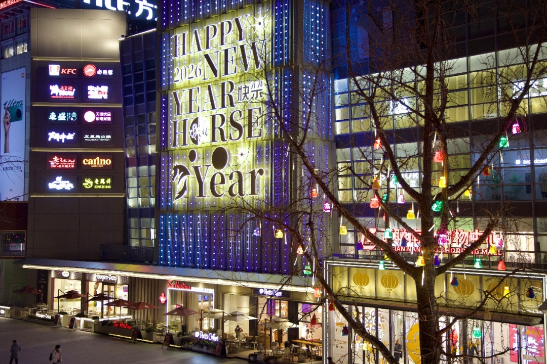 夜幕降临,百联南方购物中心外立面的 “2026 马年快乐” 巨型灯饰璀璨夺目。金色的灯光字体在炫彩背景的映衬下,显得格外耀眼,传递着满满的新春祝福。