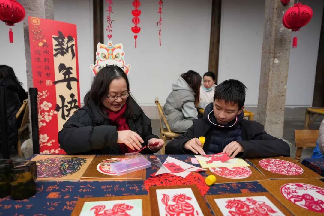 传统拓印与剪纸体验区同样备受青睐。志愿者手把手指导居民操作雕版拓印,“马到成功”等吉祥图案跃然纸上;剪纸技艺让长者重温儿时记忆,也让孩童感受非遗魅力,亲手完成的作品成为珍贵的新春纪念。