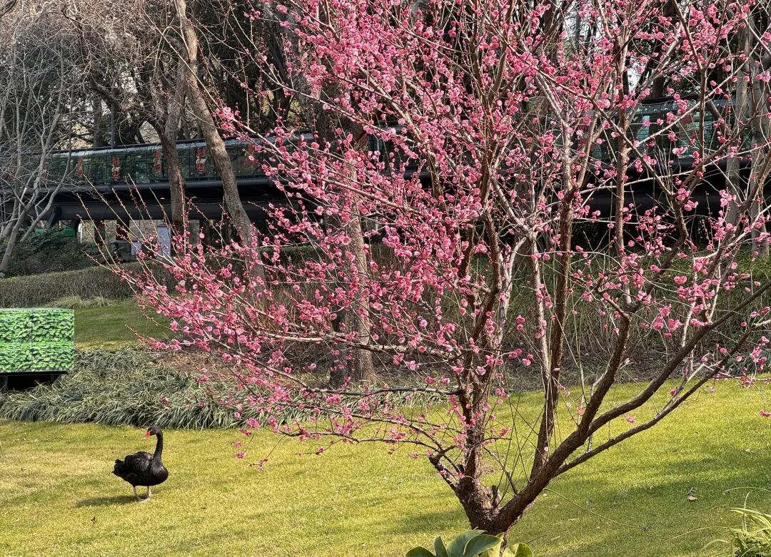 申城今日晴空万里,阳光普照。上午十点,徐家汇公园内游人渐多,黑天鹅在草地上昂首振翅,岸边红梅吐蕊、郁金香初绽,色彩交织。汇金湖畔,市民或晒太阳、或打太极,不少家长带着孩子散步玩耍。园内各处挂起红灯笼、贴起福字,新春装饰年味十足,不时有市民停下脚步拍照留念。