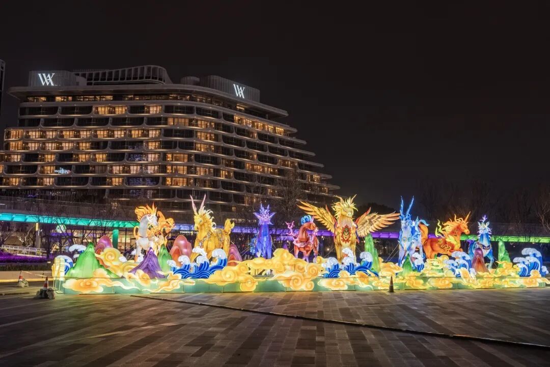 震旦国际大楼、花旗集团大厦、上海中心大厦、浦东美术馆、白玉兰广场、国际港务大厦、国际客运中心建筑群等黄浦江沿岸的主要建筑媒体立面播放春节主题宣传画面。 (黄浦江两岸夜景) (前滩友城公园“八骏图”主题灯饰)