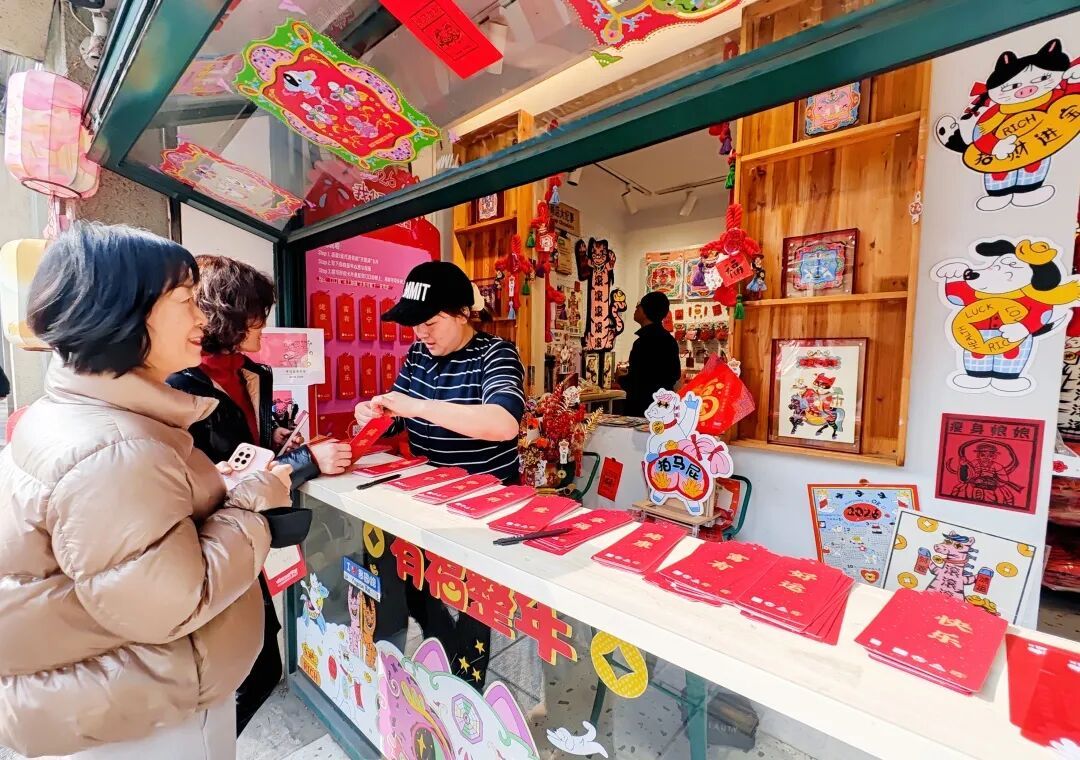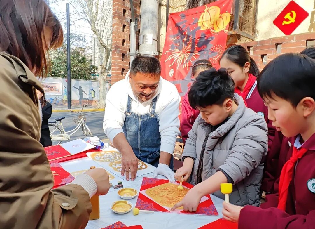 百年愚园路上,故事商店特别推出马年新春故事卡片,门口梧桐树上挂满新年祝词;愚园路历史名人墙迎来市级海派石雕非遗代表性传承人陆炯,现场展示拓印“福”字技艺,辖区学生通过“社校联盟”平台参与体验,并为沿街商户送福上门;求真巷的许愿树悬挂新年心愿,创邑SPACE大草坪设立“旗开得胜,愚见骑迹”马年艺术装置,营造了踏春迎祥的节日氛围。