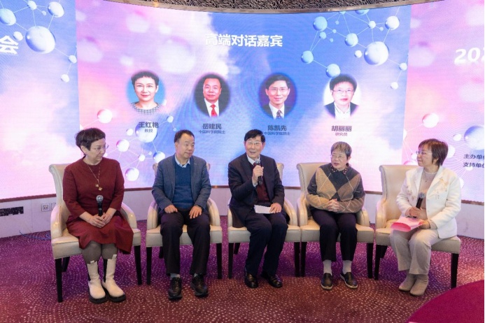 高端对话环节由上海市女科技工作者协会理事、华东师范大学教授田阳主持。陈凯先、岳建民、复旦大学代谢与整合生物学研究院院长王红艳、中国科学院上海光学精密机械研究所研究员胡丽丽等四位嘉宾围绕“巾帼同鸣聚众智、科创同心向未来——共筑多元科学生态”主题,就如何系统性支持女性科学家,尤其是青年女性,实现可持续、高质量的发展等话题进行了深入交流。