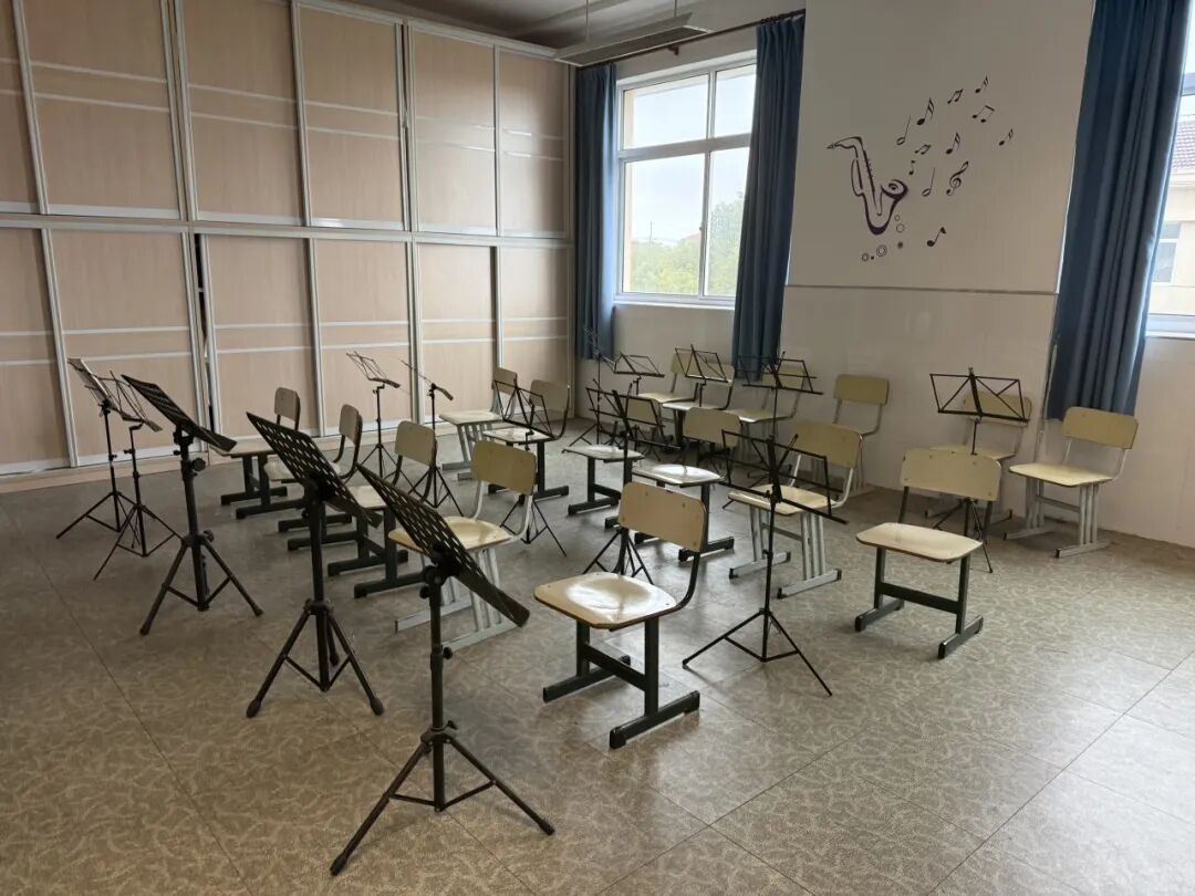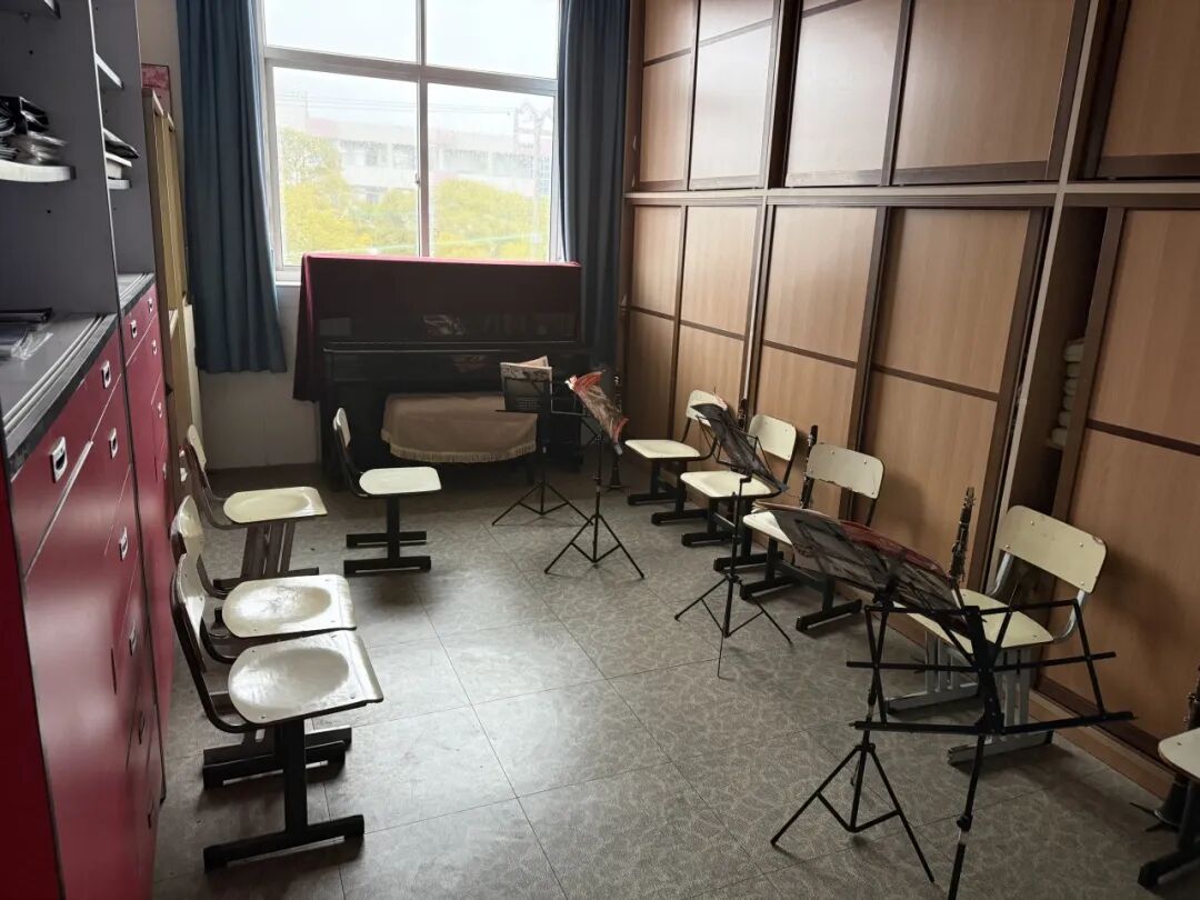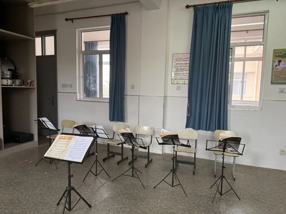 区教育局给予育才小学一定的经费支持,学校没有强求学生必须购买昂贵的乐器,因为学生数少,特地改建了几间小排练室,里面放置了谱架、乐器等,开放给学生进行分声部练习。