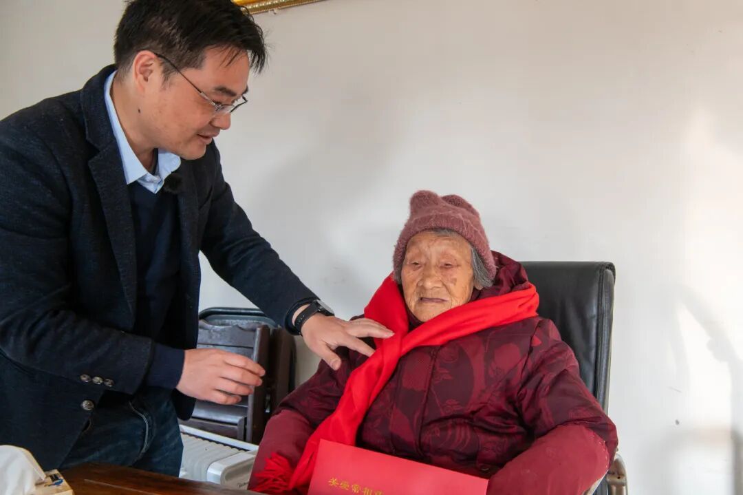 一早,阮巷村党总支书记胡兴锋敲开了百岁老人陆冬观阿婆的家门,为她送上敬老金、慰问品,贴心的系上红围巾,还贴上了“福”字。