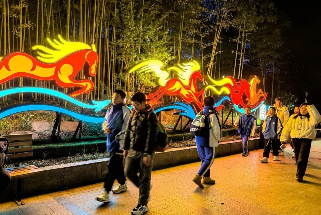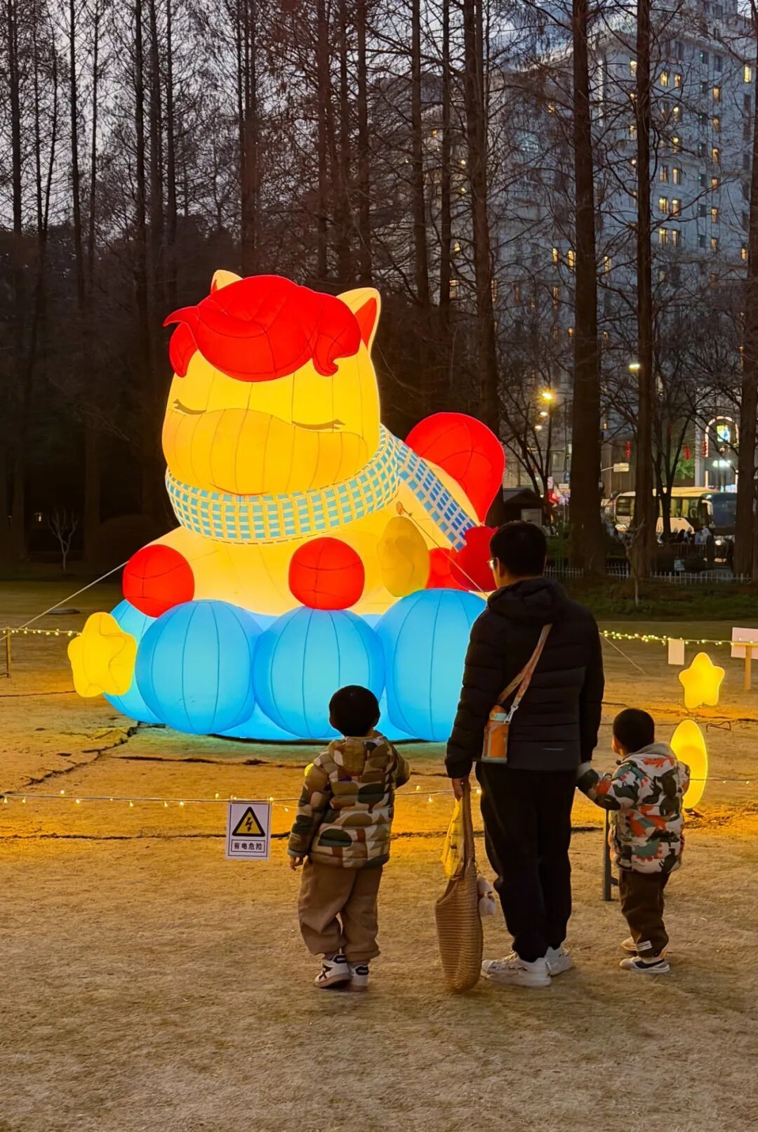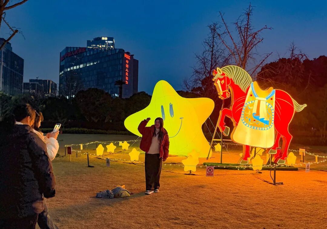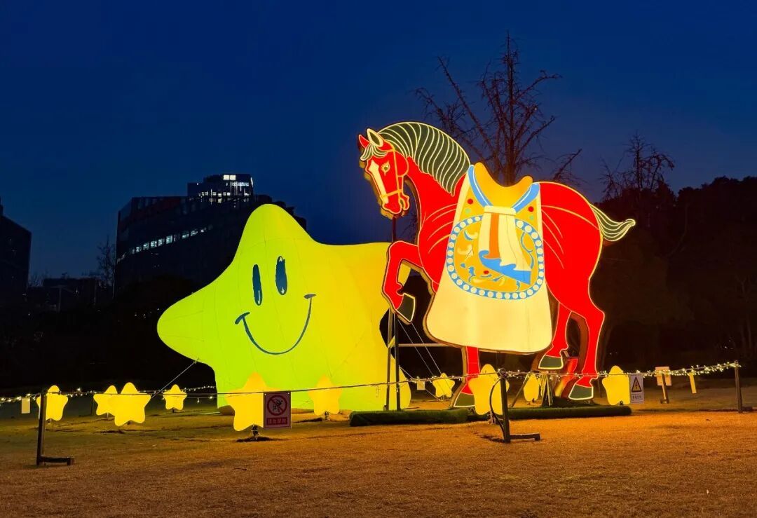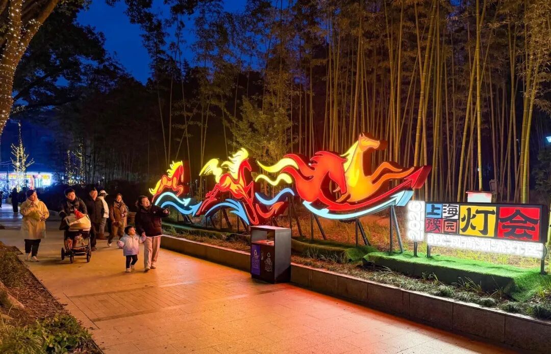 古城公园的夜被暖黄的灯火唤醒。石库门灯组沉淀岁月质感,骏马图流转灵动光晕,游客缓步其间,或驻足细观,或提灯合影,身影没入光影交织的海派长卷。
