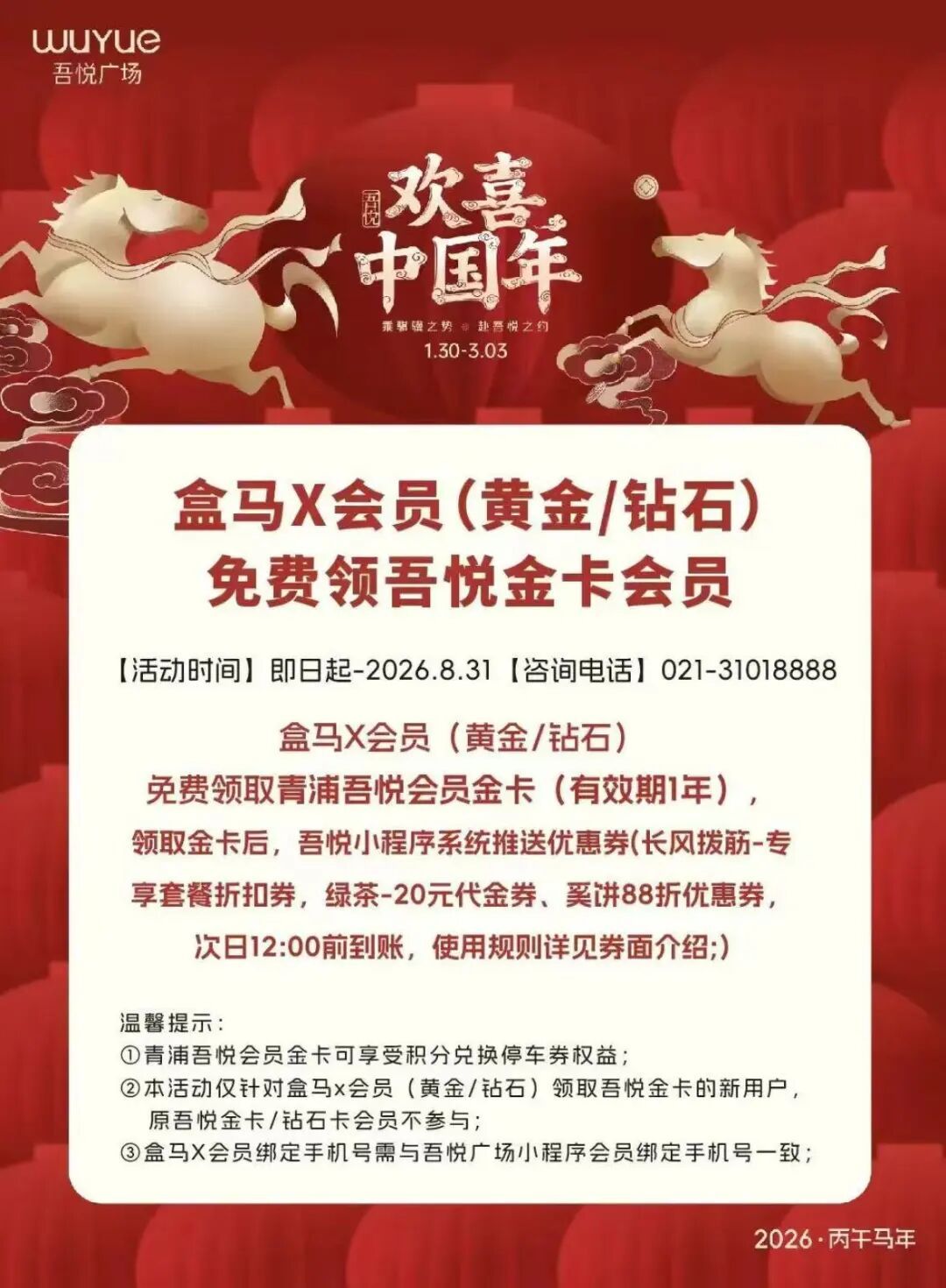 吾悦广场推出“欢喜中国年”活动,服饰、餐饮均有满减活动。青浦吾悦盒马鲜生推出满赠代金券活动。