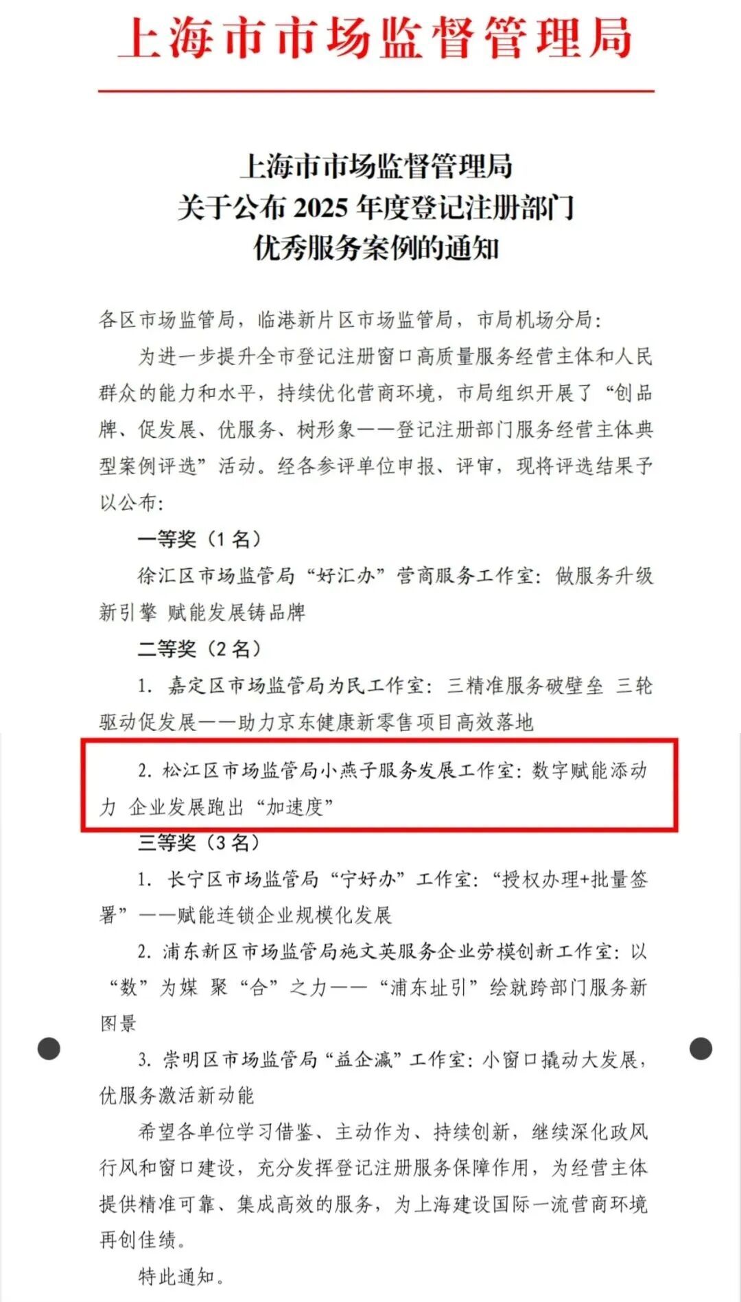 数字赋能,服务升温。从“反复跑”到“一次办”,从“不见面审批”到“智慧文书”,从“面对面”到“屏对屏”,区市场监管局的数字化实践,本质是以企业需求为导向的“服务重构”——通过数据共享打破部门壁垒,用流程再造替代“重复劳动”,让政务服务从“碎片化”走向“整体性”、从“被动等”转向“主动帮”。其相关负责人表示,下一步,“小燕子服务发展工作室”将持续紧扣数字化转型脉搏,以数字化为笔,拓展数字化应用场景、强化数据智能应用、深化跨部门协同,助力松江区打造市场化、法治化、国际化一流营商环境,让更多企业在“数字加速度”中轻装前行、茁壮成长。