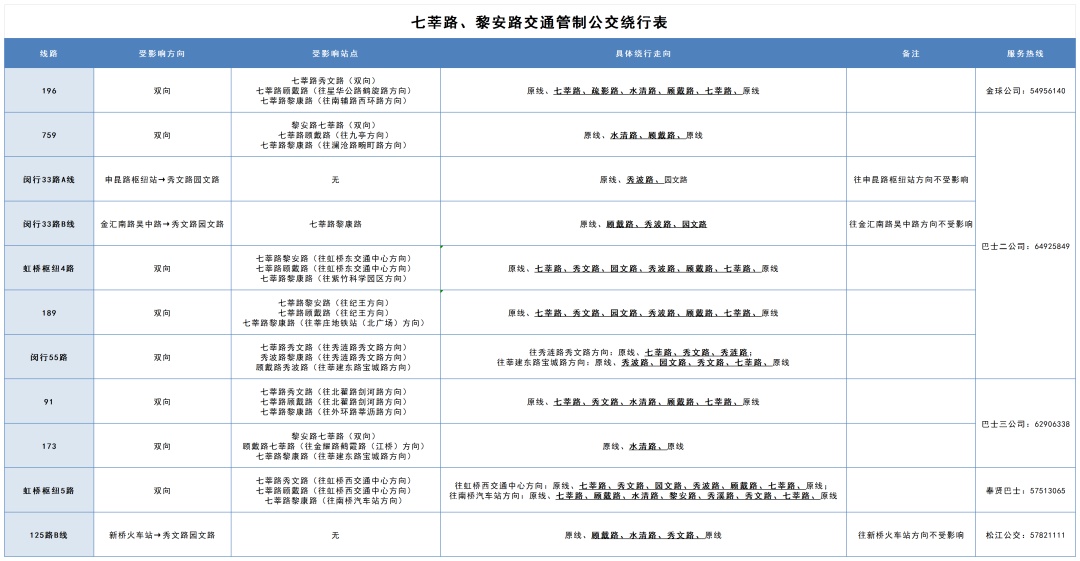 受道路封闭因素影响,公交91路、125路B线、173路、189路、196路、759路、虹桥枢纽4路、虹桥枢纽5路、闵行33路A线、闵行33路B线、闵行55路采取临时绕行措施,乘客需了解详细乘车信息,可拨打公交运营企业服务热线。