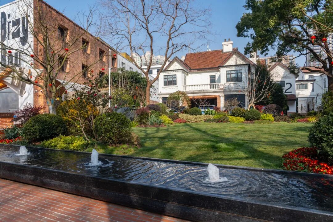 冬日上午,暖阳斜照。记者在愚园路546号看到,几位市民正悠闲地坐在临街的长椅上,面前是一汪浅浅的水景,倒映着梧桐枝影。有人捧着咖啡轻声交谈,有人独自翻着书页,还有老人推着婴儿车在此小憩。