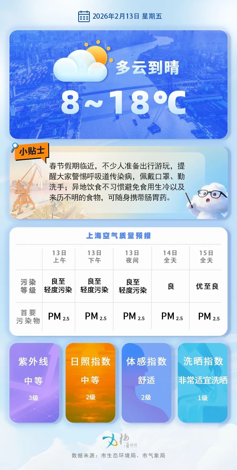 天气早知道 Feb 13 气温在8~18℃,体感较暖 夜间部分地区有雾,出行注意 今天白天多云到晴为主, 夜里云系增多, 全天气温在8~18℃, 体感较暖。 南到东南风3-4级, 相对湿度在90%-40%之间。 夜间部分地区仍有雾, 有出行安排需注意。 今明两天回暖明显, 周六最高气温直冲21℃, 夜间转为阴到多云有时有小雨, 是近期最暖湿的一天。 春节假期天气出炉! 春节假期天气 春节期间两头雨,中间多云到晴,整体气温偏高,气象条件总体适宜。 01 假期初期(15日~17日) 春节假日初期受较强冷空气影响,有一次大风降温过程,并伴有小雨;陆地最大阵风6~7级,沿江沿海地区、长江口区、洋山港区和上海市沿海海面7~8级;15~17日最低气温降幅可达6~8℃,部分郊区可能达到寒潮标准。 02 假期中期(18日~21日) 假期中期(初二至初五)以多云到晴天气为主,气温逐日回升,气象条件总体适宜。 03 假期后期(22日~23日) 假日后期云系再度增多,有一次弱降雨过程。