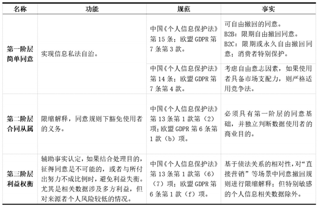 在数据财产权领域首先需要面对的问题是,个人信息相关数据财产权需要满足《个人信息保护法》等保护性规范要求。意定许可指向《个人信息保护法》第13条第1款第1项,即“取得个人同意”,使得处理目的得到来源者的确认。在实践中人们作出同意时,很少人结合具体场景对处理目的进行审慎判断,大部分人不会在浩如烟海的一揽子文件中花费时间。虽然在同意的基础上基于自决权尚未确立绝对性的“数据权”(Rechts am eigenen Datum),任何处理数据的意定许可仅具有相对效力,但有效的同意机制能够使来源者对这种决定权进行经济利用以换取服务,从而产生使用利益这一财产性权益。数据使用者也可以由此合法地获取数据使用机会。因此,同意不仅仅是一种形式上的法律许可,其在实质上通过个人干预自身权益的方式赋予初始生产者和数据使用者事实上的使用利益遵从“未经许可不得使用”这样的一般性行为禁令。在数据业实践中,绝大多数以个人信息相关数据为履约标的的合同都是在格式条款的基础上达成的。通过同意机制对数据确权的困难在于,缺乏统一、充分、实质、可行的实践审查标准,而仅仅能够用抽象的表述来宣示个体权益的重要性,以及数据使用者应当达到的注意义务标准。这些标准取决于同意机制所要求的透明性和知情权,以及决定的自愿性和自主选择的自由度。因此更务实的做法是基于透明性、自愿性和表意自由度,在法律规范的基础上将其发展成一个阶梯式的解释工具。以典型的互联网经济场景为例,分析如下:第一,当合意形成于一般的社会交往之中,交易透明性程度最低、表意自由度最低,因而企业获取的数据使用机会限制最多,数据财产权强度最弱。例如信息来源者走入商场试图连接公共网络时勾选“同意”,来源者的经济意愿主要集中于“用数据换取生活便利”。如果此时问他是否愿意让企业充分使用其个人信息相关数据,得到的答案往往是否定的,但为了便利其作出的行为却是背道而驰,也就是所谓的“数据隐私悖论”。这种同意仅仅是一种简单同意,属于单方法律行为,既可以在侵权法中表现为被害人同意,也可以在意定代理中表现为内部授权行为,此时来源者可以任意撤回同意而不受限制。第二,当合意形成于具体的数据服务之中,交易透明性程度居中、表意自由度居中,因而企业获取的数据使用机会可以基于合同规则而加以扩张或限缩。例如信息来源者从商场出来开始使用网约车App,来源者的经济意愿主要集中于“用数据换取特定服务”,从而节省开支或分享利润。如果此时问他是否愿意让企业充分使用其个人信息相关数据,得到的答案往往是看情况而定,在有限的使用程度并且不妨害个人权益的前提下,企业合理使用数据是得到默许的。在数据服务或数据产品的合同关系中,同意作为履约内容或订约条件,属于合同的主给付义务,这显然超越了简单同意,使得数据业权获得高于简单同意模式的强度。来源者此时不能真正地“任意”撤回同意,而是应当对任意撤回同意规则进行目的性限缩解释。要注意的是,简单同意和承诺是有区别的。债务人可以承诺作出同意,但仅构成债权请求权,债务人必须从实际行动上履行承诺。尽管在经济上存在联系,但简单同意和承诺,在法律上本身就是两个相互独立的行动,前者是“你可以”,后者是“我承诺”,因此在具体数据服务中的同意不仅需要具备简单同意的程度,还需要具备债法层面的承诺意义。在达成债务关系后,保护义务以及合同附随义务将会成为重要的判断内容。第三,当合意形成于明确的价值交换之中,交易透明性程度最强、表意自由度最强,因而企业获取的数据使用机会可以基于权益转让规则而扩张。例如商场为特定群体用户提供定制会员服务,并优化广告推介程序。来源者的经济意愿主要集中于“用数据换取交易对价”,从而直接实现经济价值,具体实现方式既包括节省开支或分享利润,也包括人格权益商品化的对价。如果此时问他是否愿意让企业充分使用其个人信息相关数据,得到的答案往往是看合同约定。在合同约定的框架下,企业充分使用数据是来源者获得经济利益的交换条件。在人格权益商品化方面,数据与肖像等人格要素并无二致,都可以通过商品化实现人格权益的附属财产价值。再如罕见病数据的研究授权合同,由于稀缺的个人疾病数据可以推动治疗手段的升级以及商业化运作,因此最充分的数据使用行为是完全可行且被容忍的。而治疗费用的豁免、恢复阶段的经济供给、意外情况下的经济补偿都是可接受的,原因在于此类数据使用利益建立在“权益转让同意”的模式下。由于个人和机构对数据的使用效率不同,允许特定主体之间转让数据使用机会,无论是用于社会福祉还是用于私营逐利,在法律上都应当建立一条合法路径允许通行。例如在数据交易合同关系中,企业明确要求来源者进行数据给付行为,从而开展算法模型训练、特定数据特征分析等活动,此时对任意撤回同意规则应当进行更为严格的限缩解释,让数据使用者可以基于合同而抗辩,对抗来源者事后的反悔。第三层次的同意已经具备了处分行为的特质,来源者的同意直接改变了双方的法律地位,属于“处分层次的清偿行为”(Erfüllungsgeschäft auf der Verfügungsebene)。此时来源者的同意超越了简单同意