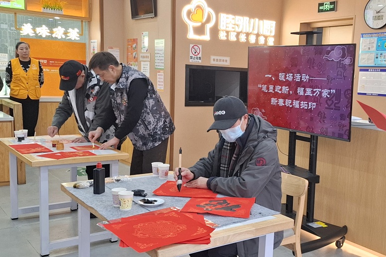 下午两时许,长者食堂内暖意升腾。本次活动由长海路街道服务办联合社工办、中国邮政集团公司上海市杨浦区分公司举办,以“笔墨迎新,福至万家”新春送福拓印开场。在欢快的乐曲声中,老兵代表们亲手体验拓印春联和“福”字。墨香氤氲间,一个个饱满的“福”字跃然纸上,寄托着对家国的深情祝福,也为新春增添了浓郁年味。