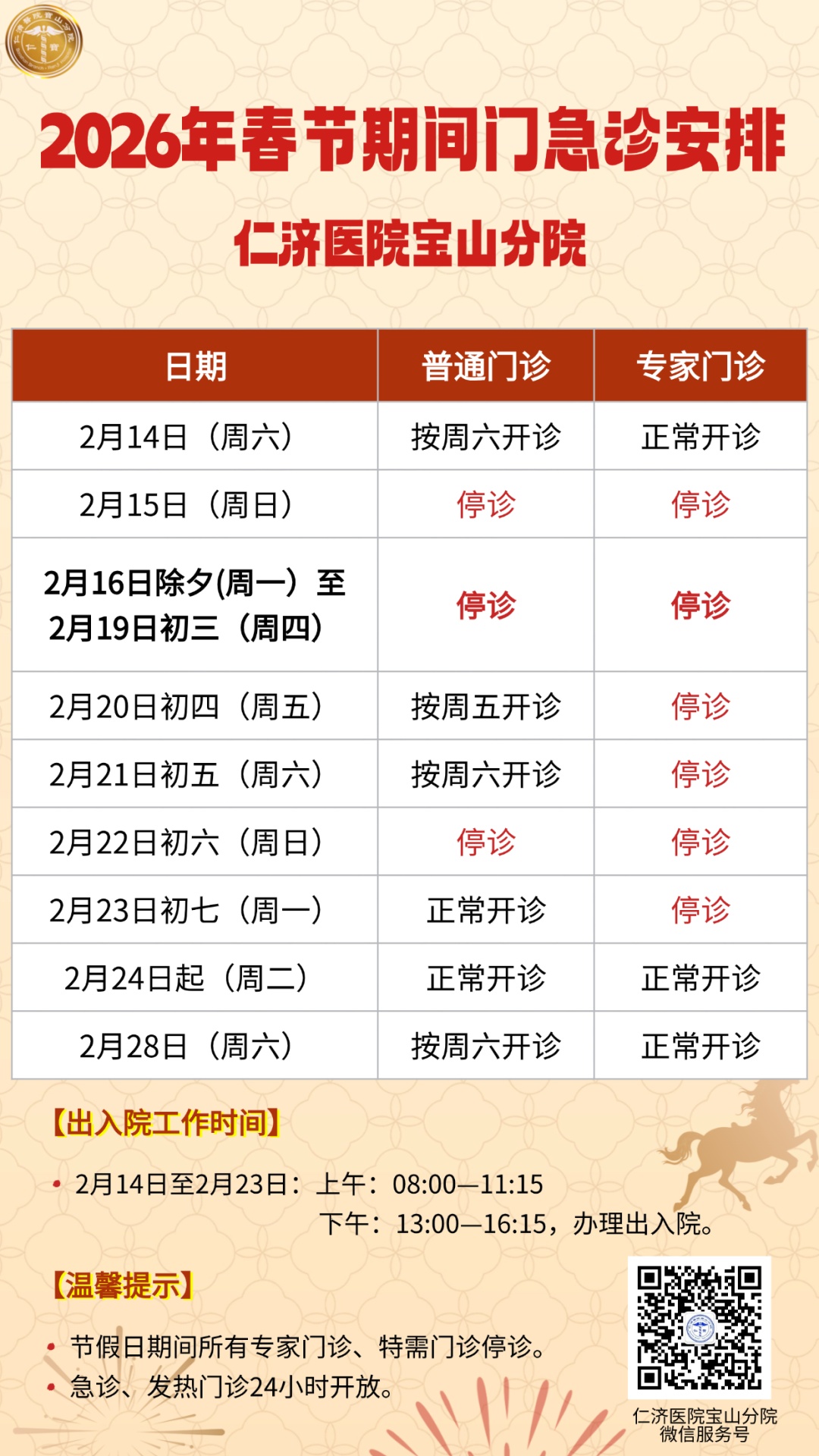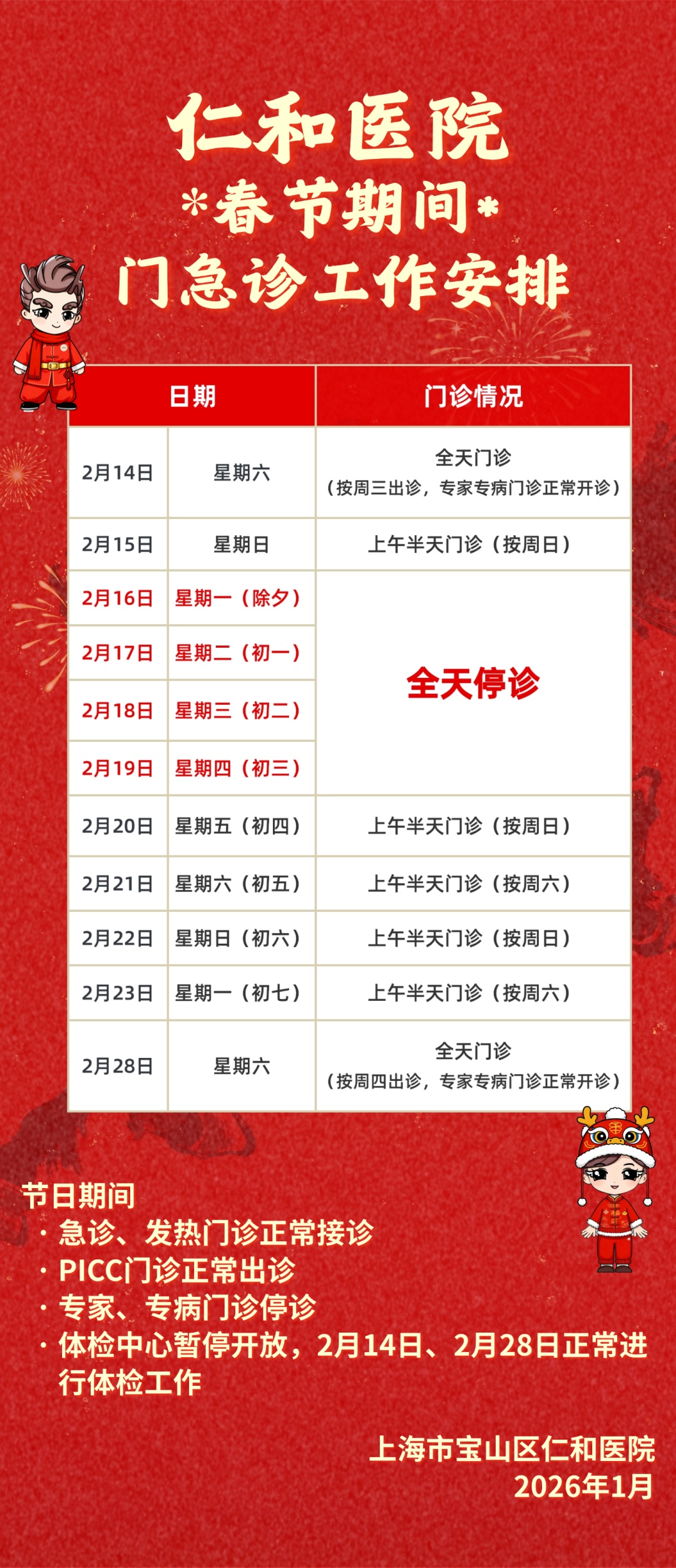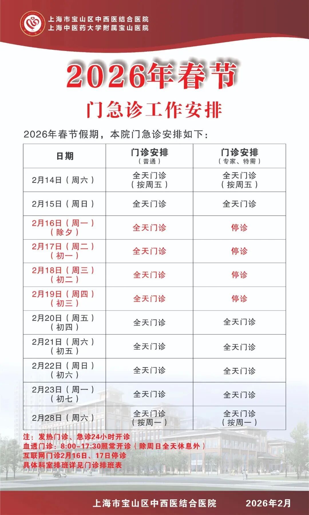 2026年春节即将到来,小编汇总了宝山区各综合性医院以及各社区卫生服务中心元旦假期的门、急诊时间安排,快转给有需要的朋友吧!