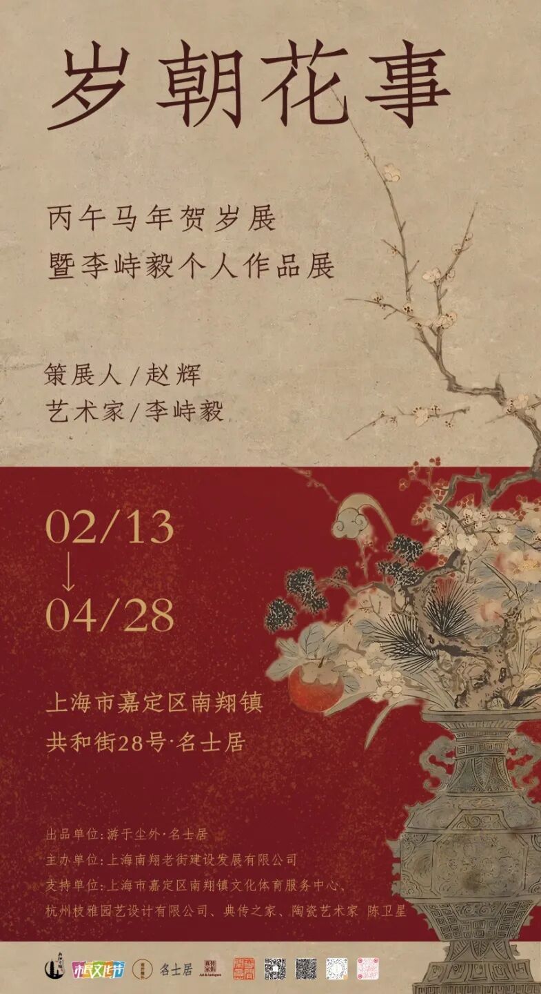 即日起至4月28日,“岁朝花事”丙午马年贺岁展暨李峙毅个人作品展将在百年老宅南翔名士居举行。展览以岁朝清供为脉络,以传统瓶花为载体,邀观众共赴一场关于花与文人生活的雅集,详见↓